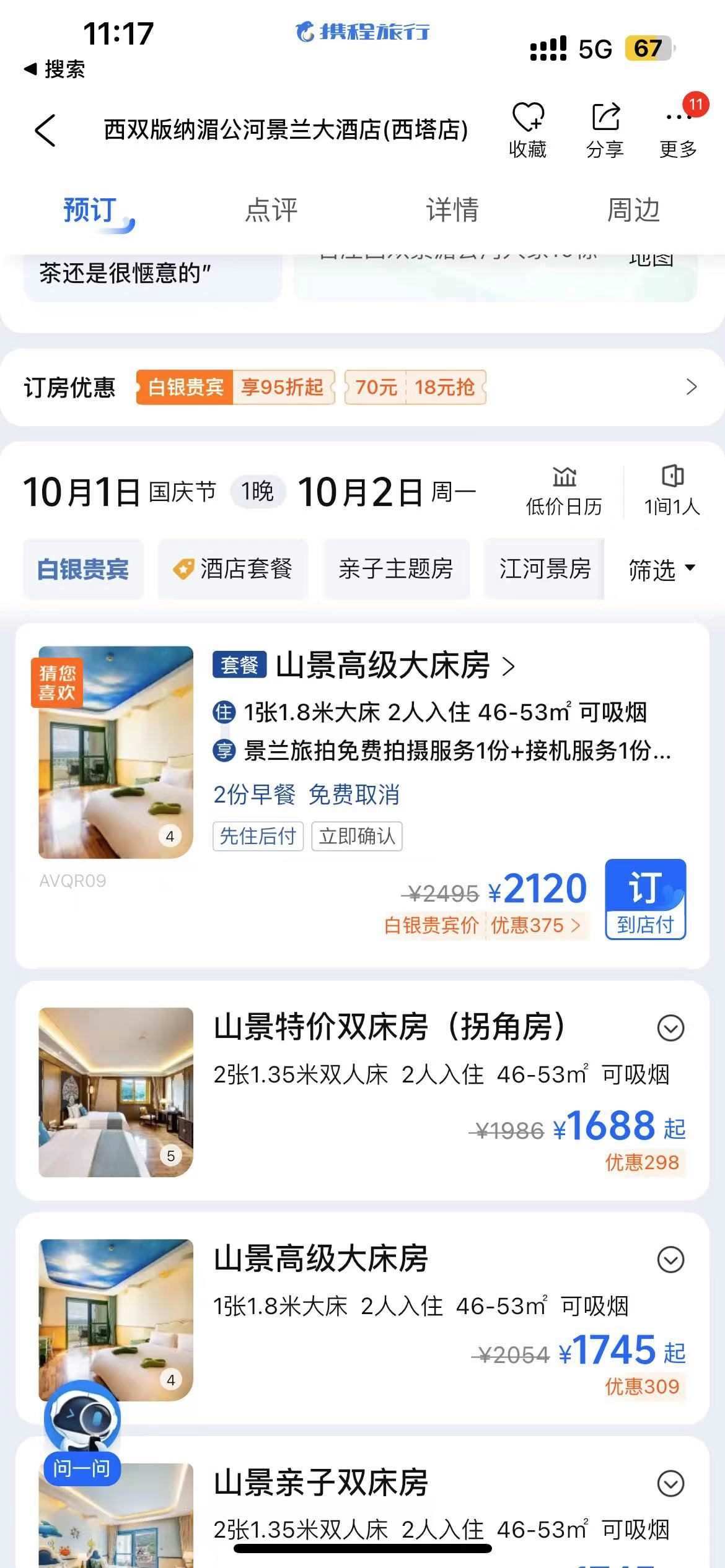 ▲西雙版納湄公河景蘭大酒店的“山景高級(jí)大床房”,在10月1日入住、10月2日退房,標(biāo)價(jià)為2120元