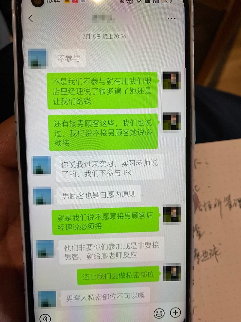 7月15日,王糖霏向班主任李老師反映門店安排他們接待男顧客事宜,并要做私密部位。李老師回復稱“男客人私密部位不可以”。