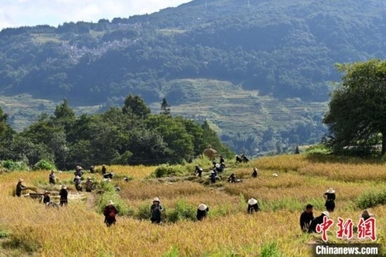 23日,正值秋分時節(jié),也是第六個中國農(nóng)民豐收節(jié),哈尼梯田染上了豐收的色彩。哈尼人民在金黃的稻田里割水稻、捉稻花魚,與四方賓客共慶豐收。為了慶祝豐收,當(dāng)?shù)剡€舉行了大型稻作農(nóng)耕實(shí)景表演。身著民族服飾的哈尼族民眾站在田埂上,以稻田為舞臺,以大地山川為背景,唱起悠揚(yáng)的哈尼古歌,手捧水稻,載歌載舞,表達(dá)崇尚自然、感恩自然之情。