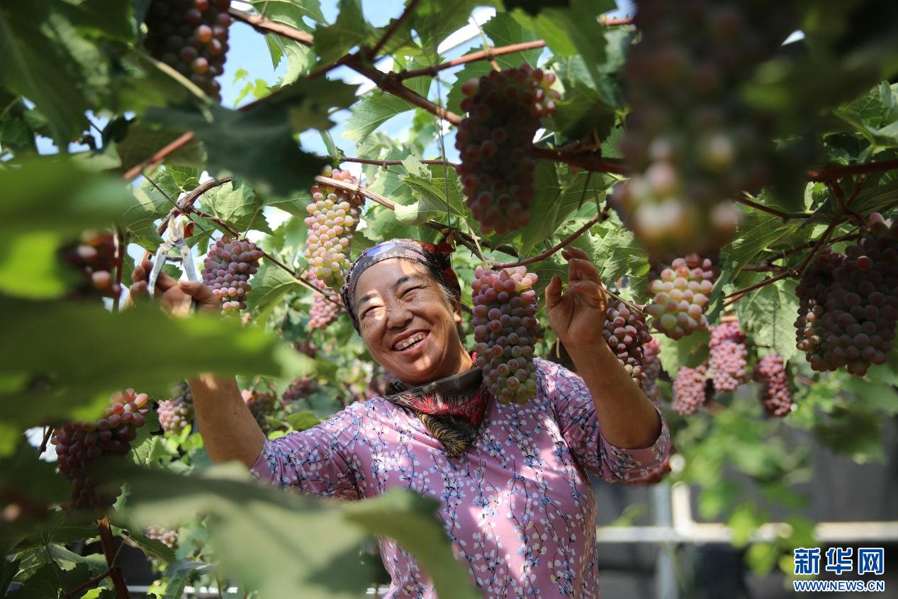 7月6日,阿勒泰農(nóng)牧業(yè)公司工作人員摘下成熟的葡萄。新華網(wǎng) 楊騰格爾 攝