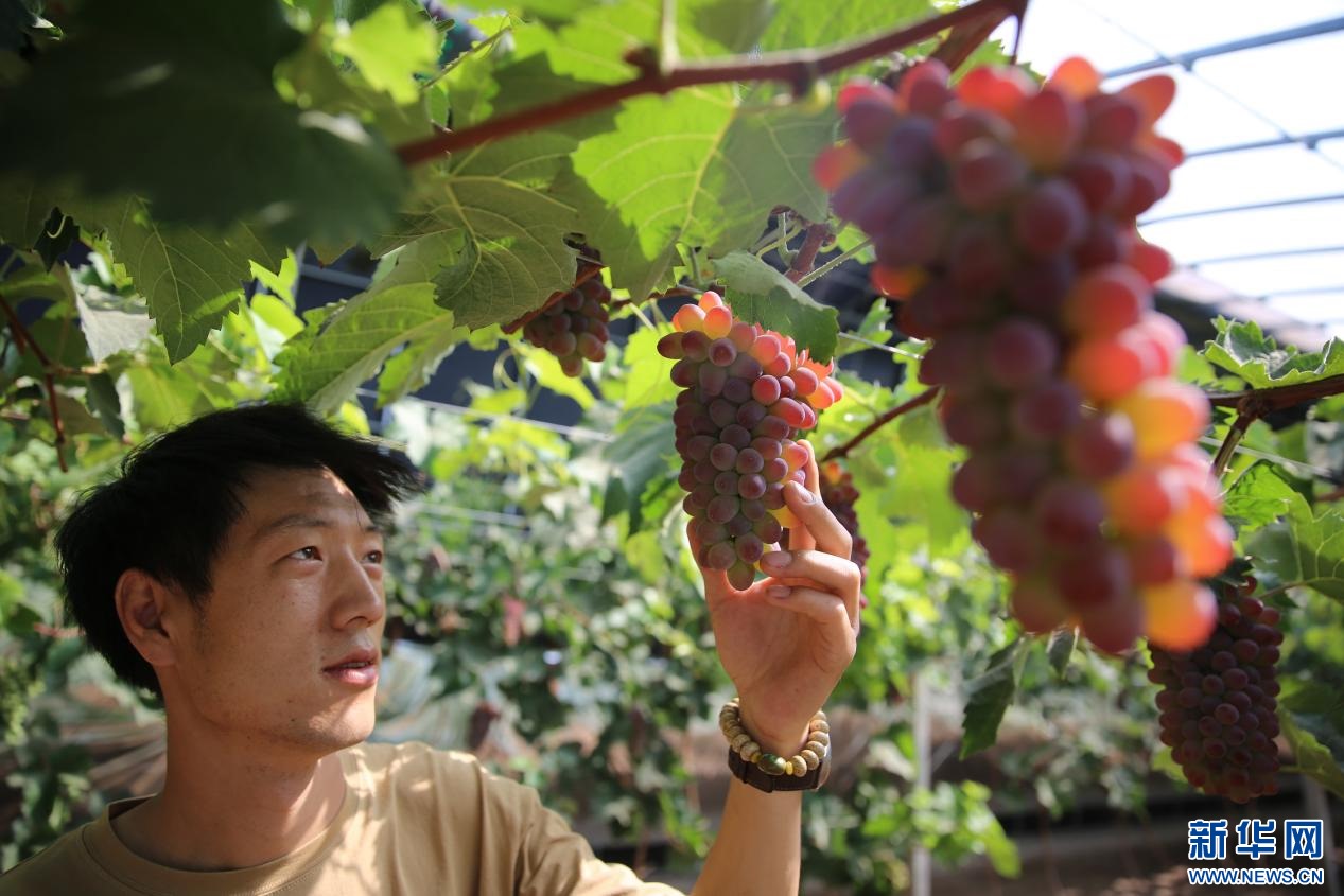 7月6日,阿勒泰農(nóng)牧業(yè)公司工作人員查看葡萄長勢。新華網(wǎng) 楊騰格爾 攝