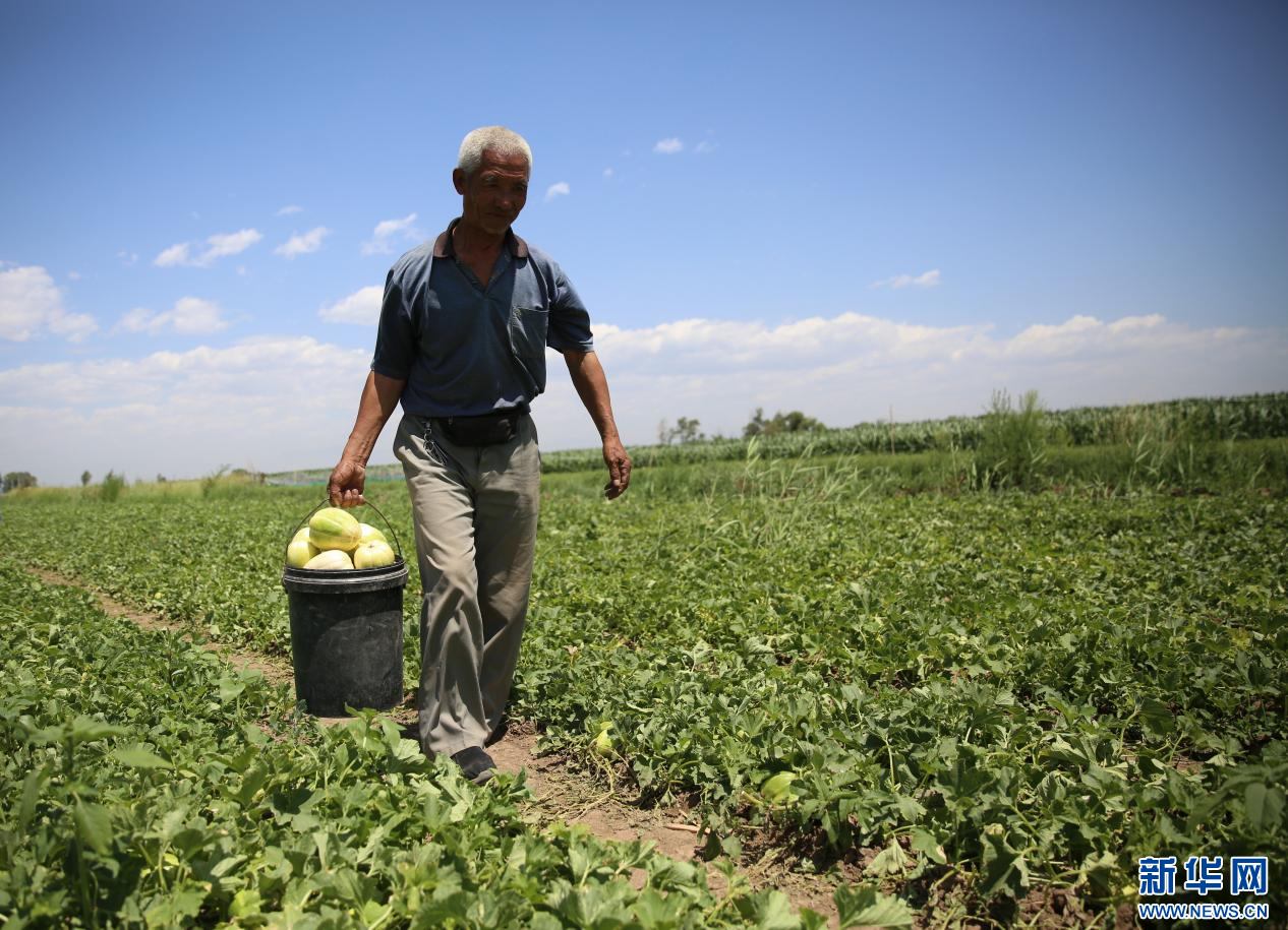 7月6日,農(nóng)民在呼和浩特市土默特左旗口肯板村的香瓜種植基地收獲成熟的香瓜。新華網(wǎng) 楊騰格爾 攝