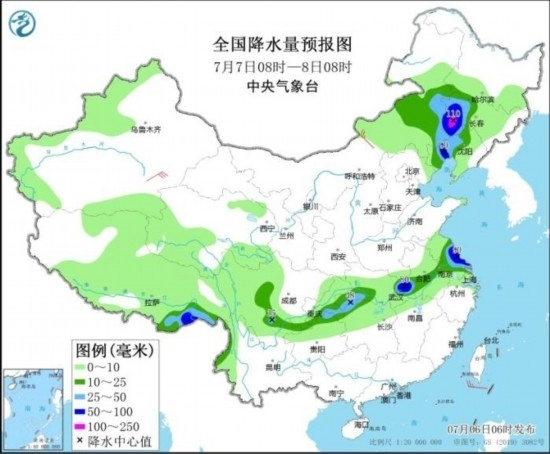 7月7日08時至8日08時,內(nèi)蒙古東南部、吉林西部、遼寧西部、蘇皖中部、河南南部、湖北東部和西南部、重慶東南部、湖南西北部、貴州北部、四川南部及西藏東南部等地的部分地區(qū)有中到大雨,局地有暴雨或大暴雨(100~110毫米)。內(nèi)蒙古中部、新疆南疆盆地等地的部分地區(qū)有4~6級風。東海南部海域有6~7級、陣風8級的西南風。