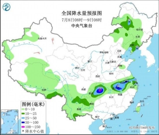 全國降水量預報圖(7月6日08時-7日08時)。圖片來源:中央氣象臺網(wǎng)站