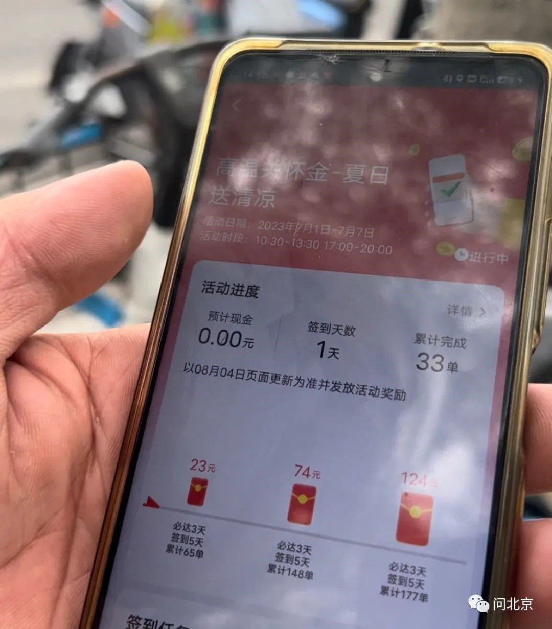 記者點進(jìn)活動頁面看到,必達(dá)3天,簽到5天,累計65單可獎勵23元錢,累計148單可獎勵74元錢,最高獎勵是累積177單可獎勵124元。但是另一名外賣小哥告訴記者,所謂的高溫關(guān)懷金,只是另一種方式的沖單獎勵。