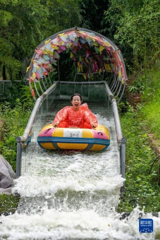 7月8日,小朋友在貴州省鎮(zhèn)遠縣羊坪鎮(zhèn)一家水上游樂園戲水游玩。