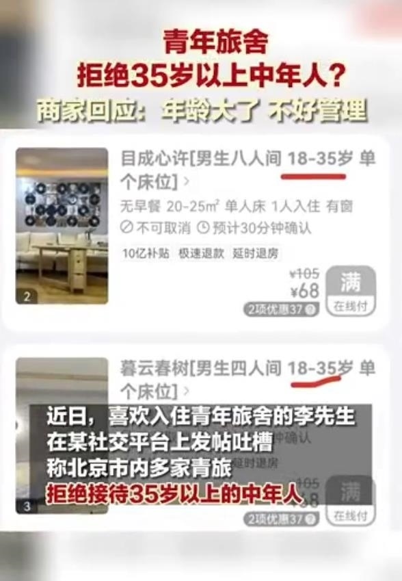 近日,#青旅不接待35歲以上人群#話題沖上熱搜,引發(fā)熱議。該話題源于一網(wǎng)友發(fā)布的帖子。該帖子表示,某平臺(tái)上北京不少青旅商家拒絕年齡35歲以上的人群入住。該網(wǎng)友詢問(wèn)原因,得到的回答是“年齡大的上下床不安全容易出事。”對(duì)此答復(fù),不少網(wǎng)友不能認(rèn)同,認(rèn)為是“借口”。