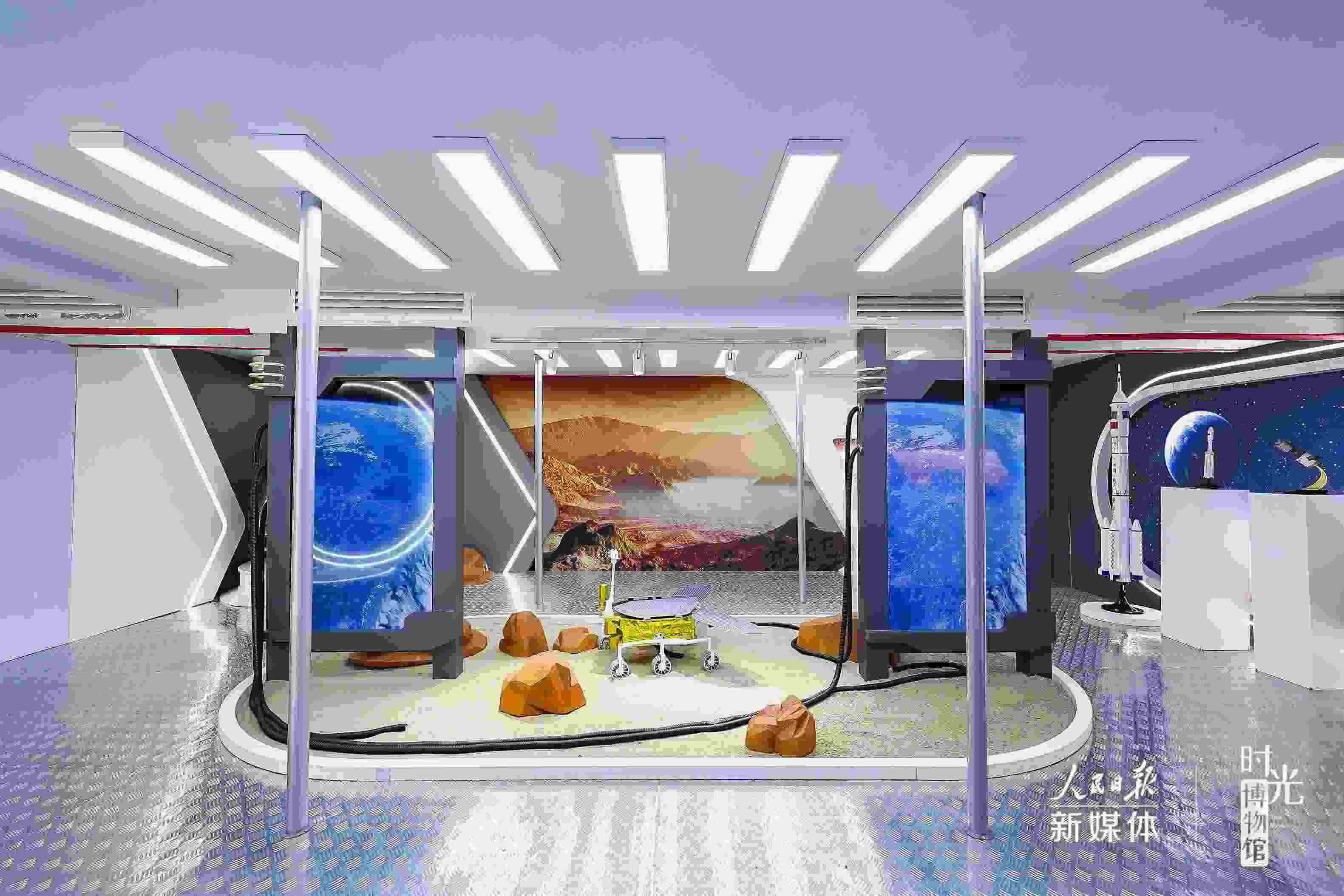 在“星辰大?!闭箙^(qū),航天器模型+視頻演示模擬真實(shí)的太空?qǐng)鼍?,?fù)古電視機(jī)循環(huán)播放過去30年的航天大事件?!吧裰邸憋w天、“天宮”遨游、“嫦娥”攬?jiān)?、“祝融”探火……將浪漫灑向宇宙,?gòu)成了中國人獨(dú)有的星辰大海。