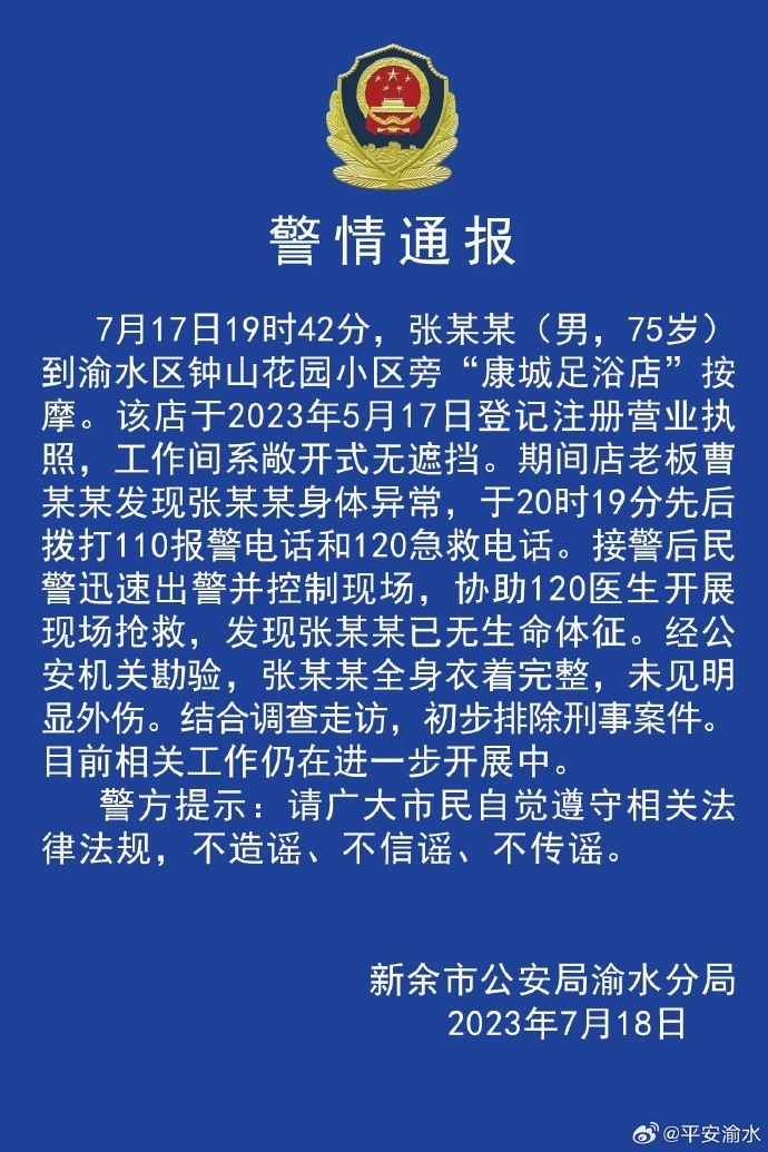 ·警方通報7旬男子按摩店內死亡:其衣著完整未見明顯外傷,初步排除刑事案件。