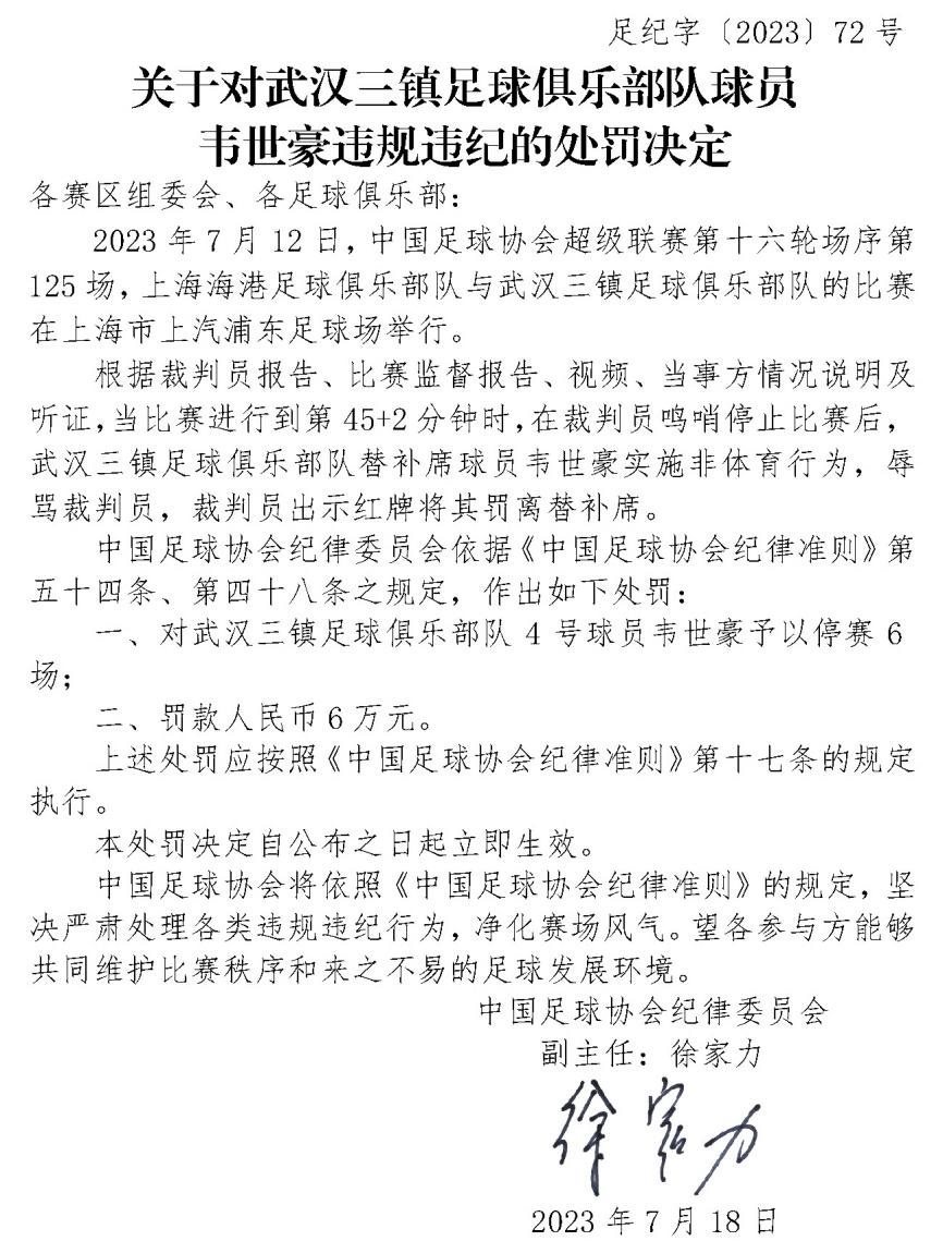 ·18日,中國足球協會紀律委員會發(fā)布重磅罰單,球員韋世豪辱罵裁判,被停賽6場罰款6萬。