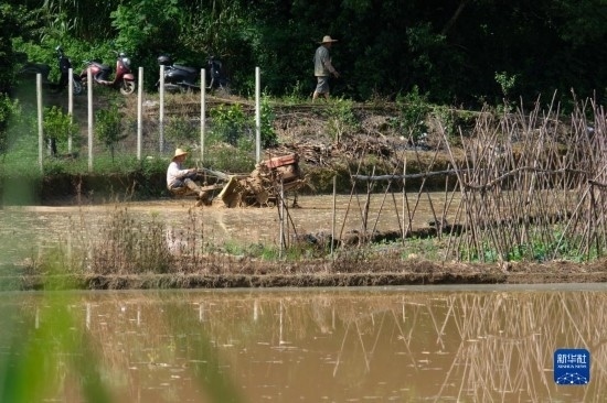 7月21日,農(nóng)民在南寧市青秀區(qū)長塘鎮(zhèn)耕田。新華社記者 周華 攝