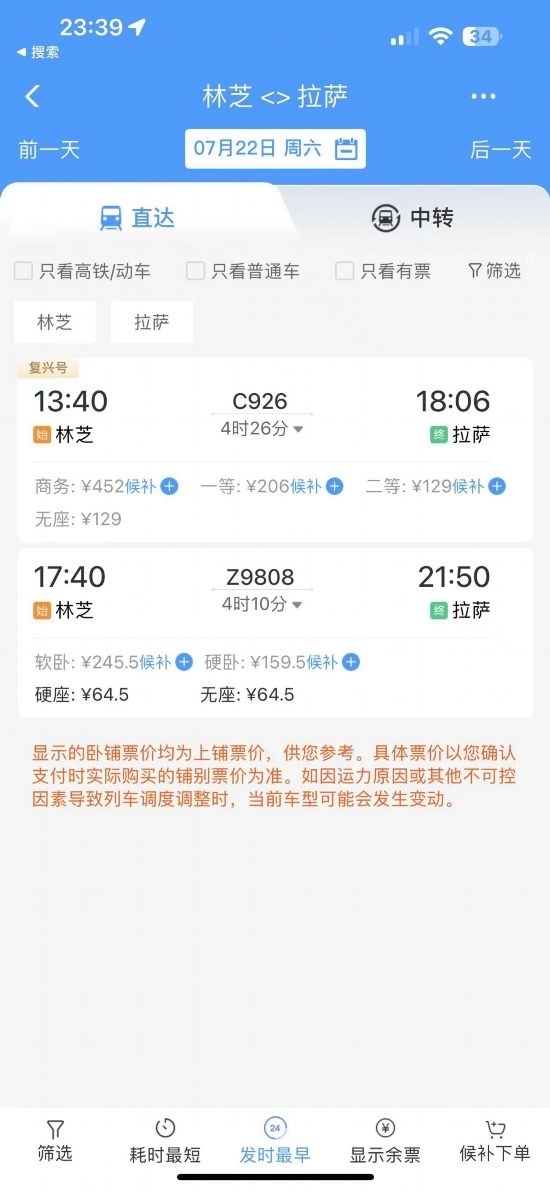 通過在鐵路售票APP上查詢發(fā)現(xiàn),從林芝開往拉薩的復興號城際列車的二等座票價為129元,直達特快列車硬座為64.5元。“相比較原先180元的客運汽車票價,直達特快列車便宜了近乎三分之一?!辈芟壬锌卣f道。