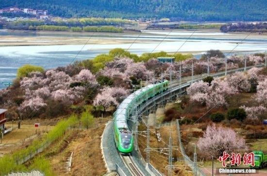 資料圖:桃花、嫩柳與國槐綠涂裝的高原復興號。 馬生明 攝