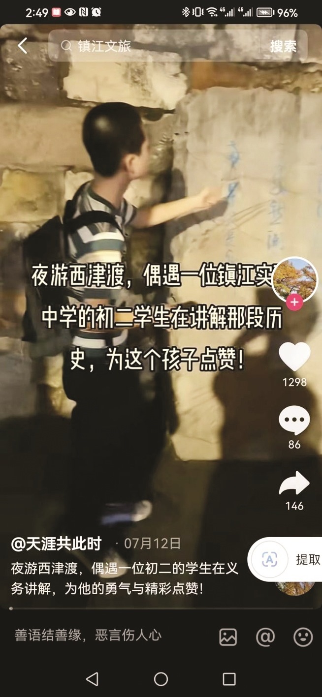 揚(yáng)子晚報(bào)訊(記者 萬(wàn)凌云 通訊員 湯婉蓉 孫冬)“人類(lèi)的歷史與功績(jī)會(huì)隨著時(shí)間而消失。但是中國(guó)將在他們身上繼續(xù)存在,我們將保持他們高舉的旗幟……”7月22日,一段鎮(zhèn)江初中學(xué)生講解歷史的視頻爆火,他們的講解地位于歷史底蘊(yùn)深厚的鎮(zhèn)江西津渡景區(qū)。