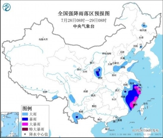 預(yù)計(jì),7月28日08時(shí)至29日08時(shí),江蘇南部、安徽南部、浙江、福建、江西東部以及甘肅東部、陜西中部、云南南部、河南北部、山東西北部和東南部等地的部分地區(qū)有大到暴雨,其中,浙江北部和東部、福建東部等地的部分地區(qū)有大暴雨,局地特大暴雨(250~280毫米)。上述部分地區(qū)伴有短時(shí)強(qiáng)降水(最大小時(shí)降雨量30~60毫米,局地可超過(guò)80毫米),局地有雷暴大風(fēng)等強(qiáng)對(duì)流天氣。中央氣象臺(tái)7月28日06時(shí)繼續(xù)發(fā)布暴雨橙色預(yù)警。