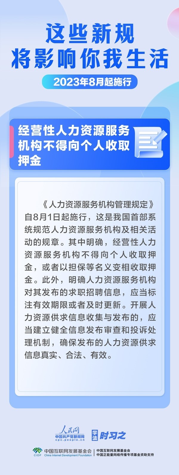 促進生成式人工智能健康發(fā)展;擴大適用個稅優(yōu)惠政策的商業(yè)健康保險產品范圍;明確經營性人力資源服務機構不得向個人收取押金……8月,這些新規(guī)施行,將影響你我生活。