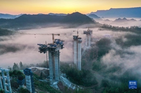 8月4日在湖南省湘西土家族苗族自治州龍山縣拍攝的桑龍高速公路灣檔河特大橋施工現(xiàn)場(chǎng)(無人機(jī)照片)。