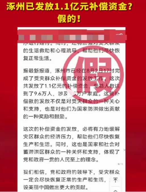 近日,網(wǎng)傳消息稱“河北省涿州市已經(jīng)在8月2日完成了1.1億受災(zāi)群眾補(bǔ)償資金的發(fā)放工作,受益人數(shù)達(dá)到了9.6萬人,涉及3.5萬戶家庭”。