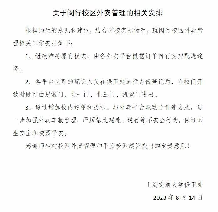 通知顯示,即日(8月3日)起,原外賣平臺(tái)向保衛(wèi)處備案過(guò)的外賣配送員,可從東川路600號(hào)(“凱旋門”)入校完成配送,未經(jīng)平臺(tái)報(bào)備的外賣配送員禁止進(jìn)校配送,只需將交大外賣訂單送至就近中轉(zhuǎn)站即可。9月1日起,所有外賣配送員禁止入校,校園外賣專送團(tuán)隊(duì)承接所有校園外賣訂單。