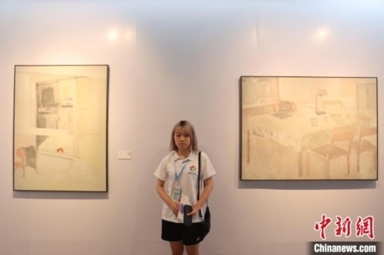 8月26日下午,廣東省廣州市,粵臺(tái)學(xué)子中華情——2023兩岸大學(xué)生文化藝術(shù)夏令營啟動(dòng)儀式暨“融·合”兩岸大學(xué)生藝術(shù)交流展開幕式在廣東華僑博物館舉行。圖為臺(tái)灣學(xué)生在兩岸大學(xué)生藝術(shù)交流展作品前留影。吳善基攝
