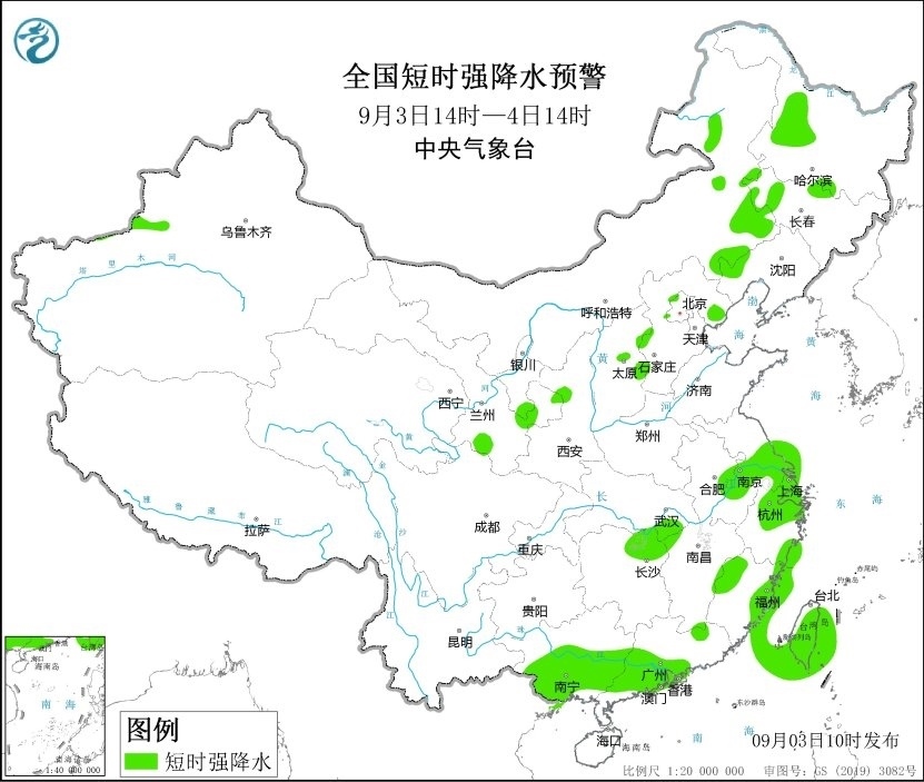 預(yù)計9月3日14時至4日14時,內(nèi)蒙古東南部、吉林西部、遼寧西部、山西中部、河北中部和東北部以及福建東部和西北部、廣西南部和東南部沿海、臺灣島等地的部分地區(qū)將有8-10級雷暴大風(fēng)或冰雹天氣,局地可達(dá)11級以上;內(nèi)蒙古東部、黑龍江西部、吉林西部、遼寧西部、甘肅南部、山西中部、河北西部和東北部、江蘇中南部、安徽東部、上海、浙江北部、福建東部和西北部、廣西南部、廣東西南部、臺灣島等地的部分地區(qū)將有短時強降水天氣,最大小時雨量20-50毫米,局地可達(dá)70毫米以上。