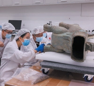 多角度拍照,記錄數(shù)據(jù)信息;觀察文物表面附著物,視情開展儀器檢測(cè);分析病害情況,采取除銹、緩蝕、整形、拼接、補(bǔ)配等方法處理……在距祭祀?yún)^(qū)發(fā)掘現(xiàn)場(chǎng)約1.5公里的三星堆博物館文物修復(fù)中心,青年文物修復(fù)師楊平和同事們正在師父郭漢中的帶領(lǐng)下開展青銅器等文物的清理修復(fù)工作。