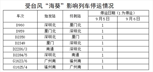 據(jù)中央氣象臺消息,今年第11號臺風“海葵”于今天(9月5日)早晨5點20分前后在福建省東山縣沿海登陸,福建東部部分地區(qū)將有大暴雨,并伴有短時強降水,局地有雷暴大風等強對流天氣。為防范臺風影響,保障鐵路運輸安全,中國鐵路南昌局集團有限公司繼續(xù)調(diào)整部分旅客列車運行方案,停運管內(nèi)途經(jīng)杭深線福州南至詔安,龍漳線龍巖至漳州,昌福線三明北至福州等區(qū)段旅客列車。同時,加開15趟旅客列車,方便旅客出行。
