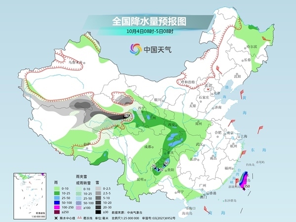 明天,新疆北疆北部和南疆盆地高海拔地區(qū)、西藏北部,青海東部和中南部、甘肅西部等地有中到大雪或雨夾雪,其中青海東南部部分地區(qū)有暴雪,局地大暴雪(20~28毫米);甘肅南部、陜西中南部、四川東北部、重慶中西部、貴州西北部、湖北西部以及臺(tái)灣島等地有中到大雨,其中貴州西北部、臺(tái)灣島中東部部分地區(qū)有暴雨或大暴雨,臺(tái)灣島東南部局地特大暴雨(250~350毫米)。