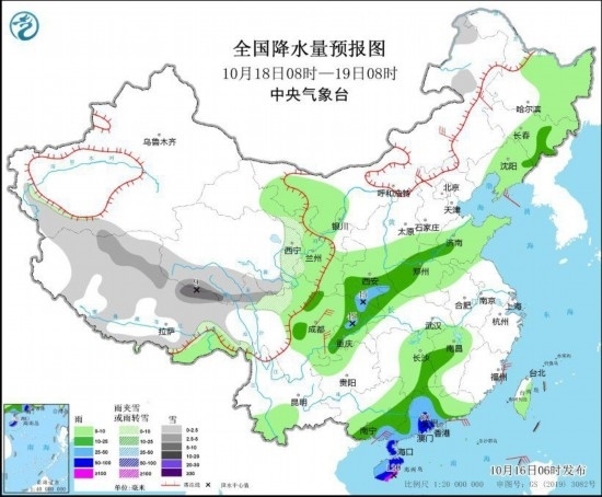 10月16日08時(shí)至17日08時(shí),新疆北疆北部和南疆南部山區(qū)、西藏北部和東部、青海等地的部分地區(qū)有小到中雪或雨夾雪,其中,新疆北疆北部、青海中部等地局地有大雪;甘肅南部、寧夏、四川西南部和盆地西部、云南東北部和南部、海南島、臺(tái)灣島等地的部分地區(qū)有小到中雨,其中海南島東部有大雨,局地暴雨(50~90毫米)。黑龍江中東部、廣西東南部、海南島、西藏中部等地有4~6級(jí)風(fēng),其中西藏中部的部分地區(qū)風(fēng)力可達(dá)7級(jí)以上。
