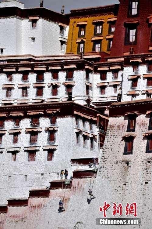 10月19日,西藏拉薩,工作人員對布達(dá)拉宮外墻噴灑涂料。每年秋冬交替時節(jié),布達(dá)拉宮外墻都要進(jìn)行粉刷“美顏”。按照慣例,每季粉刷將在藏歷9月22日“神降節(jié)”前完成。