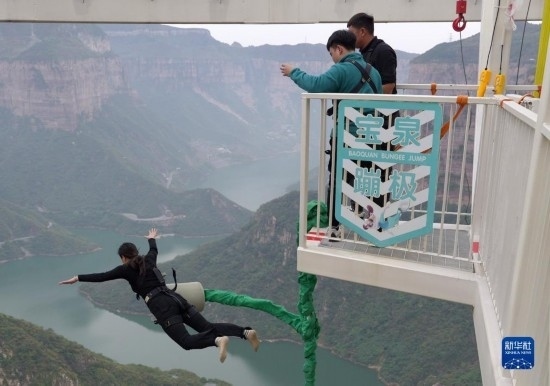 10月19日,游客在河南寶泉旅游度假區(qū)體驗(yàn)懸崖蹦極項(xiàng)目。