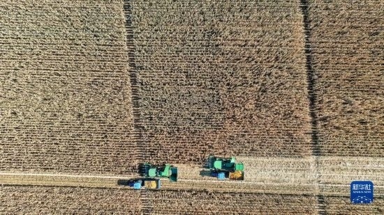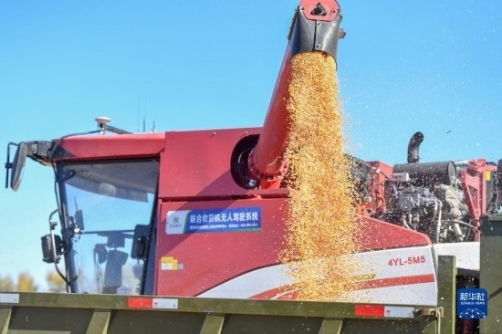 10月19日,在中國(guó)科學(xué)院“黑土糧倉(cāng)”科技會(huì)戰(zhàn)長(zhǎng)春示范區(qū)公主嶺示范基地,無(wú)人駕駛農(nóng)機(jī)在收獲玉米。