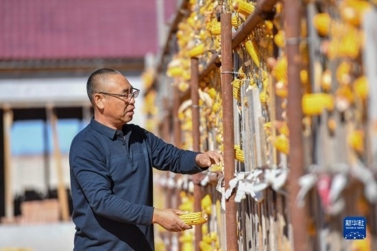 10月19日,在吉林省公主嶺市友忠種植農(nóng)民專(zhuān)業(yè)合作社,理事長(zhǎng)孫友忠查看科學(xué)儲(chǔ)糧倉(cāng)中的玉米儲(chǔ)存情況。