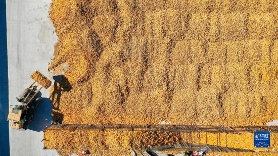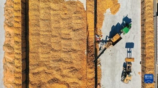 10月19日,在吉林省公主嶺市友忠種植農(nóng)民專(zhuān)業(yè)合作社,農(nóng)民將收獲的玉米放入科學(xué)儲(chǔ)糧倉(cāng)(無(wú)人機(jī)照片)。