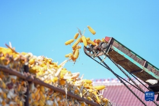 10月19日,在吉林省公主嶺市友忠種植農(nóng)民專(zhuān)業(yè)合作社,農(nóng)民將收獲的玉米放入科學(xué)儲(chǔ)糧倉(cāng)。