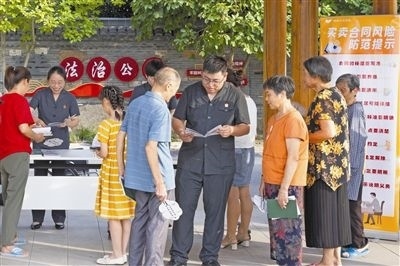 圖⑧:送法入村。圖為楓橋法庭通過(guò)設(shè)立“糾紛移動(dòng)普法站”,來(lái)到轄區(qū)各村鎮(zhèn)普法宣傳,送上普法小手冊(cè),提醒村民用好法律知識(shí),提前防范各類(lèi)風(fēng)險(xiǎn)。
