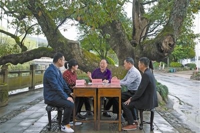 圖①:巡回審判。圖為諸暨法院法官在東溪村百年古樟樹(shù)下開(kāi)展巡回審判,依法對(duì)兩起非法狩獵的刑事案件進(jìn)行公開(kāi)審理并當(dāng)庭宣判。