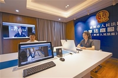 圖③:智慧建設(shè)。圖為諸暨法院楓橋人民法庭在審理一起民間糾紛案件中,因當(dāng)事人一方遠(yuǎn)在外地,故組織雙方線上開(kāi)庭,當(dāng)事人表示相當(dāng)滿意。