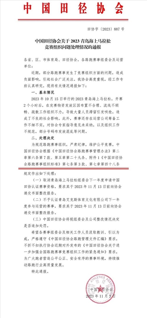·中國田協(xié)通報(bào)大連馬拉松和青島海上馬拉松問題處理情況。