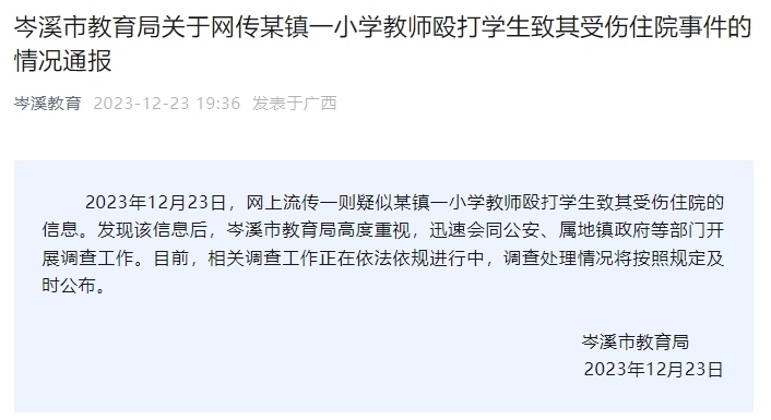 廣西岑溪通報(bào)“網(wǎng)傳小學(xué)教師毆打?qū)W生致其受傷住院”:正進(jìn)行調(diào)查 “岑溪教育”微信公眾號(hào)消息,2023年12月23日,網(wǎng)上流傳......