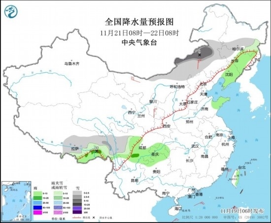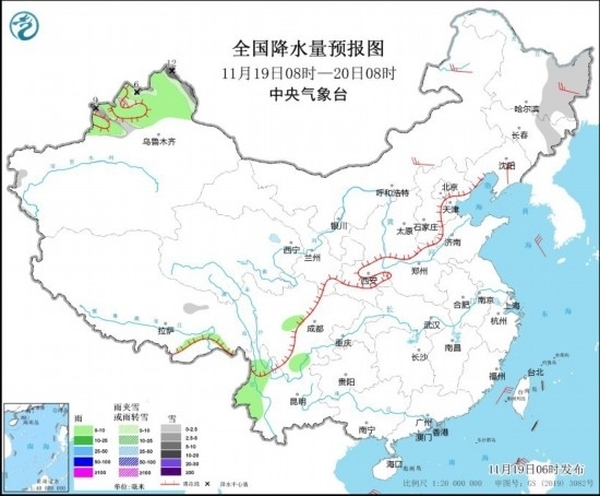 11月19日08時至20日08時,新疆北部和伊犁河谷、黑龍江東部、吉林東部等地部分地區(qū)有小雪或雨夾雪,其中,新疆北部部分地區(qū)有中到大雪,局地暴雪(10~12毫米)。新疆北部、西藏東南部、四川南部、云南西部等地部分地區(qū)有小雨。內(nèi)蒙古中部和東部、黑龍江東部、遼寧東部等地部分地區(qū)有4~5級風(見圖2)。