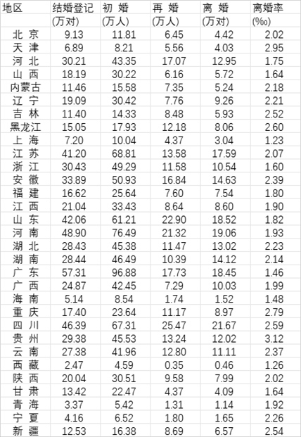 表:2022年31個省份結(jié)婚登記、初婚、再婚、離婚及離婚率數(shù)據(jù)(數(shù)據(jù)來源:《中國統(tǒng)計年鑒2023》)