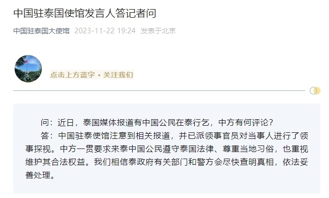 ·中國駐泰國大使館回應(yīng)網(wǎng)傳有中國公民在泰行乞:注意到相關(guān)報(bào)道,并已派領(lǐng)事官員對當(dāng)事人進(jìn)行了領(lǐng)事探視。