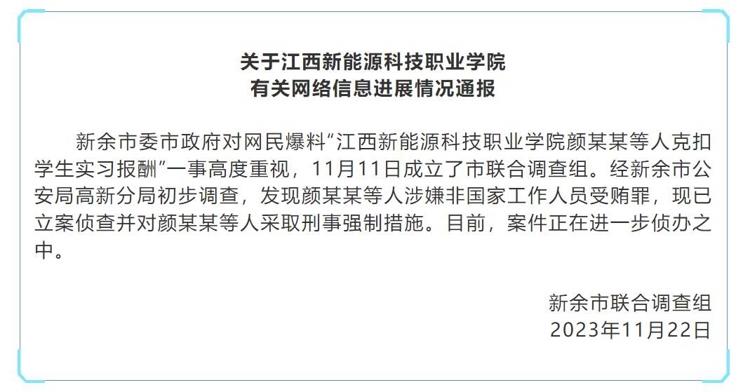 ·江西新余通報(bào)一職校被舉報(bào)克扣學(xué)生實(shí)習(xí)報(bào)酬:多人涉嫌受賄被控制。