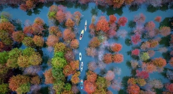 近日,位于安徽省寧國市方塘鄉(xiāng)的兩千余畝落羽杉林迎來了一年中最美的時(shí)節(jié)。一叢叢紅杉林與清澈的湖水相互掩映,充滿詩情畫意。
