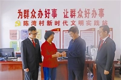 在法官的見(jiàn)證下,村委會(huì)干部將補(bǔ)償款送到陳某手中。