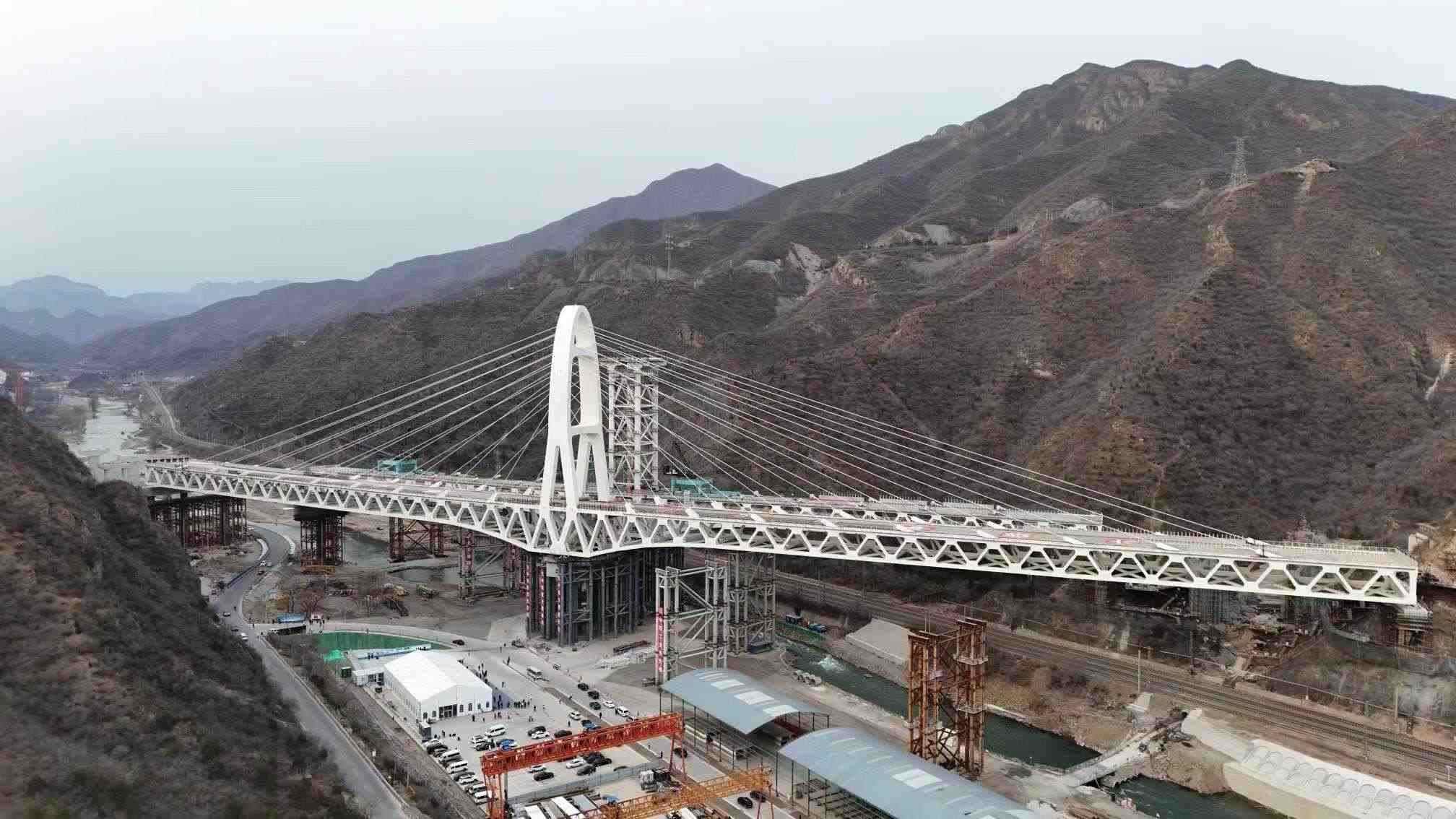 左、右兩幅風格相異卻又錯落有致的大橋屹立山間,氣勢恢宏、蒼勁挺拔,曲線梁體與橋塔造型相得益彰,更顯線條剛?cè)岵咨庥^色澤明快,與周圍山光水景完美融合。轉(zhuǎn)體施工現(xiàn)場井然有序,參建各方密切配合,大橋在人們的注視中緩緩轉(zhuǎn)動,像兩個舞者翩翩起舞,最終兩幅大橋在永定河上方牽手成功,贏得人們陣陣歡呼喝彩。