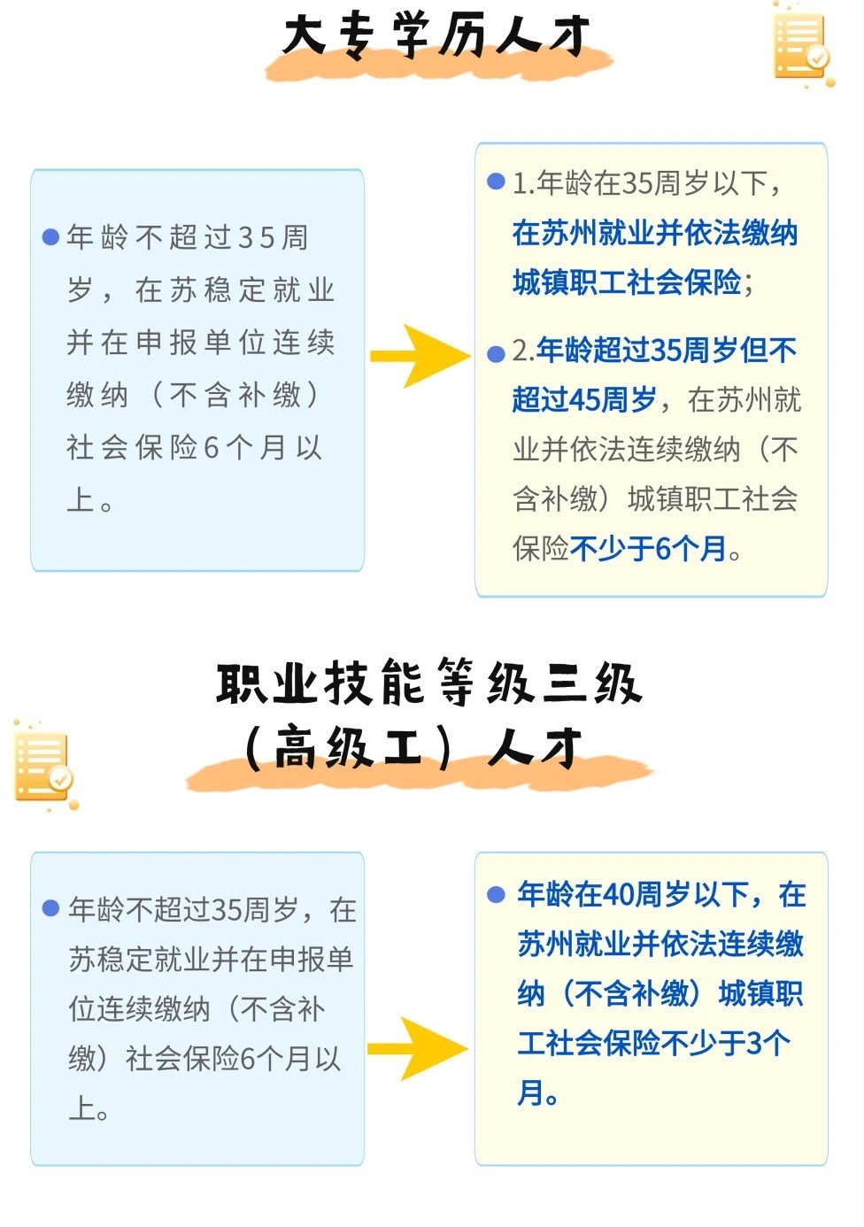 2.符合蘇州市引進(jìn)技能人才緊缺(工種)目錄的職業(yè)技能等級三級(高級工)社保繳費(fèi)年限、年齡放寬:年齡條件從35周歲放寬至40周歲,連續(xù)繳納社保時間從6個月縮減為3個月。