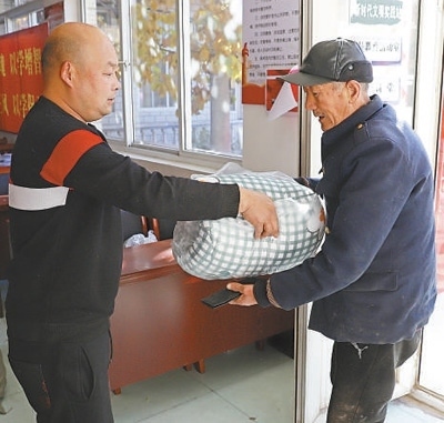 上午10時,走進(jìn)碼頭村黨群服務(wù)中心,正碰上73歲老人杜金亭騎著電動三輪車,載著老伴來領(lǐng)新棉被。為保障困難群眾冬季取暖,涿州市民政局為全市殘疾人、“六類人群”免費(fèi)發(fā)放過冬棉被。杜金亭的老伴肢體殘疾,是低保戶?!靶路颗渖闲旅薇?,這個冬天不愁了!”取上新棉被,杜金亭邀請記者去新家看一看。