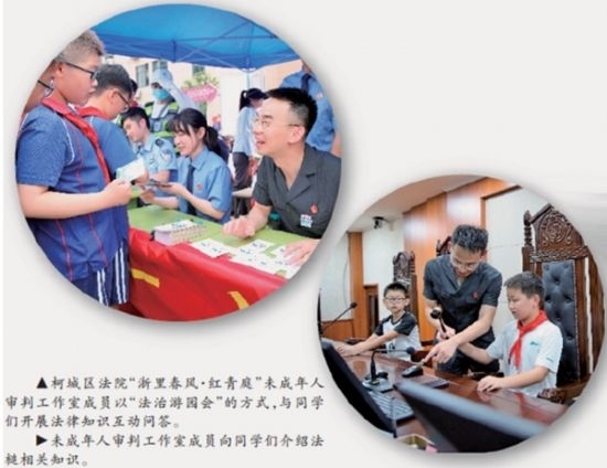“‘紅青庭’品牌Logo中,‘紅’字既突出黨建統(tǒng)領(lǐng)又寓意紅領(lǐng)巾,是百折不撓的精神象征;‘青’字代表著青少年,是肩負(fù)未來的青春力量;‘庭’字則是指少年法庭和家庭。”胡衛(wèi)民介紹,柯城區(qū)法院依托“浙里春風(fēng)·紅青庭”品牌,成立青少年法治教育實踐基地和未成年人審判工作室,積極開展內(nèi)外聯(lián)動,在持續(xù)加強涉未成年人刑事、民事、行政審判融合的基礎(chǔ)上,不斷深化與公安、檢察、教育、團(tuán)委、婦聯(lián)等部門的協(xié)調(diào)配合,構(gòu)筑全方位、多鏈條的綜合司法保護(hù)機制。
